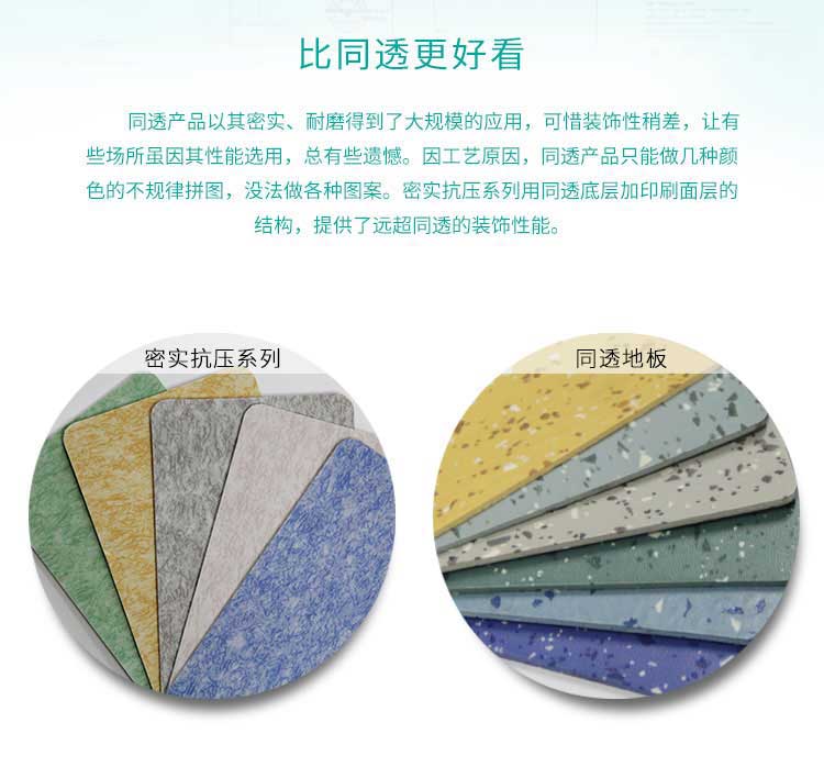 同透產品以其密實、耐磨得到了大規模的應用,可惜裝飾性稍差,讓有些場所雖因其性能選用,總有些遺憾。因王藝原因,同透產品隻能做幾種顏色的不規律拚圖,沒法做各種圖案。密實抗壓係列用同透底層加印刷麵層的結構,提供了遠超同透的裝飾性能。